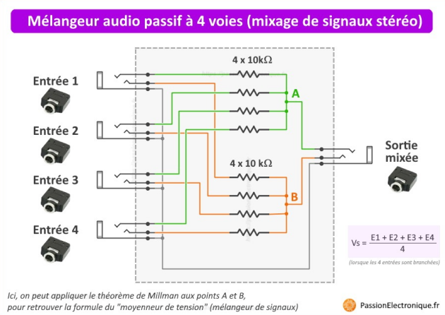 Exemple, le circuit ci-dessous montre comment mixer quatre sources audios différentes :