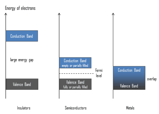 La figure ci-dessous montre l'énergie à apporter pour passer de la bande de valence (électrons associés à d'autres atomes par liaison covalente) à la bande de conduction. Vous observerez que pour les métaux ces deux bandes se chevauchent. Ce qui signifient que des électrons libres sont disponibles dans le matériau à 25 °C. \(\newline\)