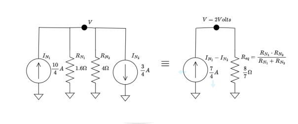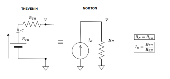 Le modèle de Norton suit la même logique mais remplace le circuit par une source de courant. On neutralise les source de courant en ouvrant le circuit. Ci-dessous l'équivalence entre le modèle de Thevenin et le modèle de Norton.