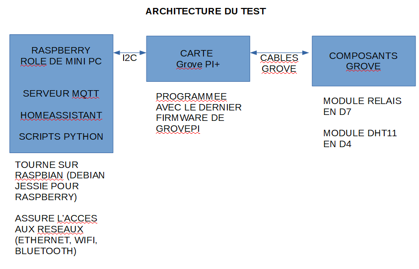 Le schéma ci-dessus reprend l'ensemble des composants et leur rôle respectif. Vous pouvez donc déduire que vous pouvez refaire ce test sans Raspberry (ordinateur Windows ou linux) et sans GrovePi (Carte arduino équipée d'un shield Ethernet pour la fonction MQTT). Je vous ferais un autre billet pour le test sans Raspberry et sans carte GrovePi+.