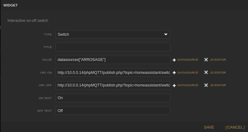 Bon on peut transmettre des données à Freeboard mais comment actionner des équipements à partir de Freeboard ? S Il existe un plugin nommé switch.js qui permet de faire le travail demandé. Souci il faudra construire des scripts php pour communiquer avec mqtt, pas de soucis c'est assez simple.