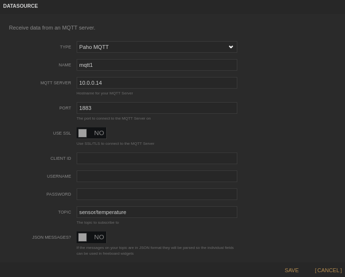 Sous Freeboard on peut ajouter maintenant un datasource de type “paho mqtt”: