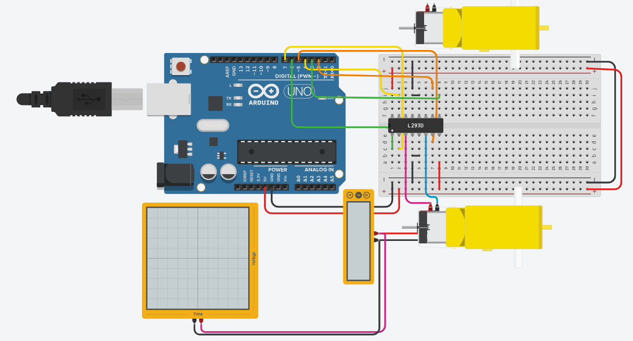 4. brancher le deuxième moteur et proposer le code pour tourner à gauche, à droite, avancer, reculer.