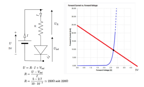 Le cas classique de l'utilisation d'une résistance est de créer une chute de tension pour adapter la tension et limiter ainsi le courant délivré. Le cas le plus typique et celui de la diode DEL. La diode a un courant qui devient exponentiel lorsque la tension augmente. On risque donc de détruire le composant. Il faut donc ajouter une résistance à la DEL pour la protéger.